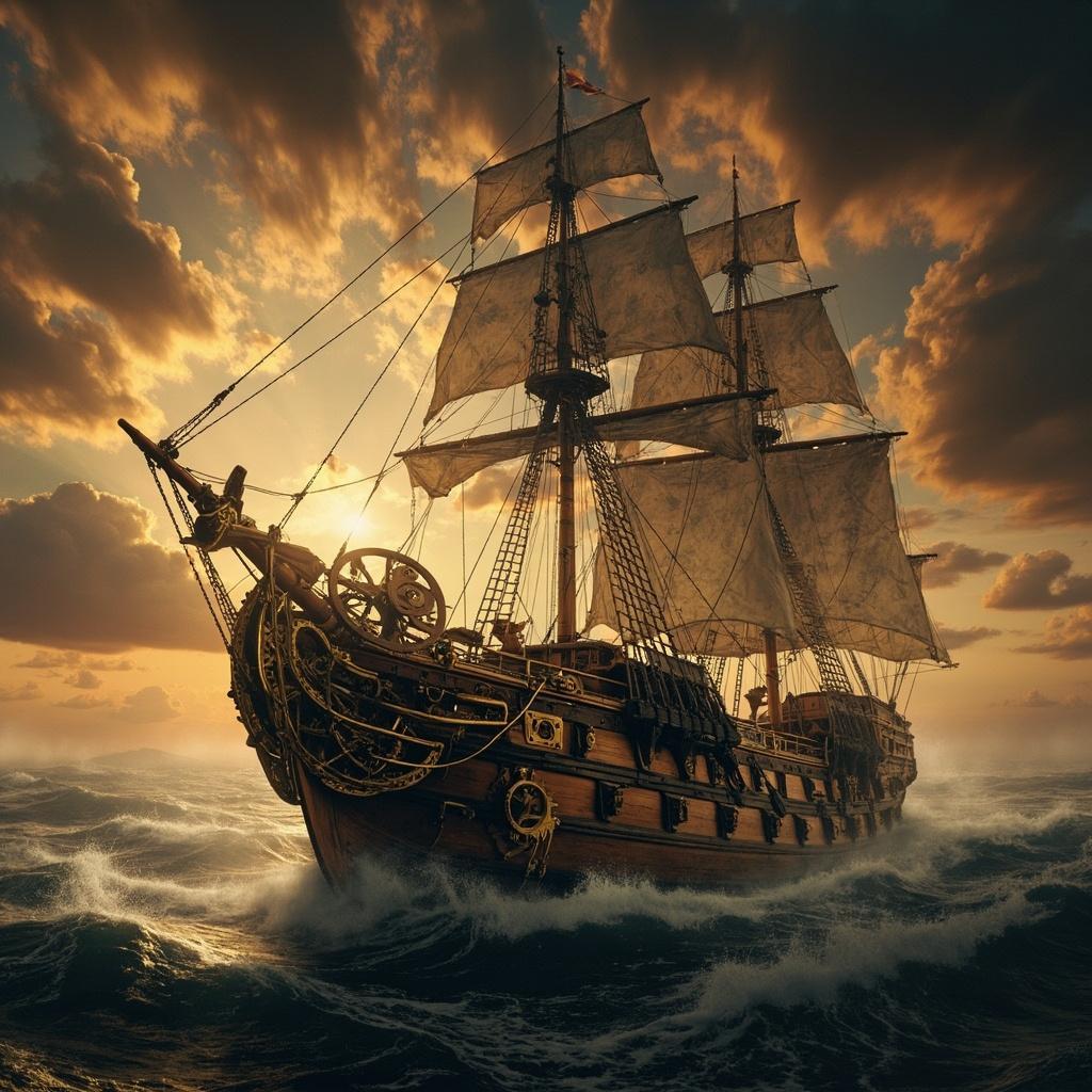 A vintage pirate galleon with massive brass gears and cogs integrated into its wooden hull and masts, sailing through a stormy sea under a dramatic sunset, Steampunk Baroque style, intricate mechanical details, dark romanticism, theatrical lighting, volumetric fog, film grain, 8k resolution, cinematic aspect ratio 2.39:1, sharp focus, hyper-detailed, inspired by Barón Munchausen and 18th century maritime fantasy