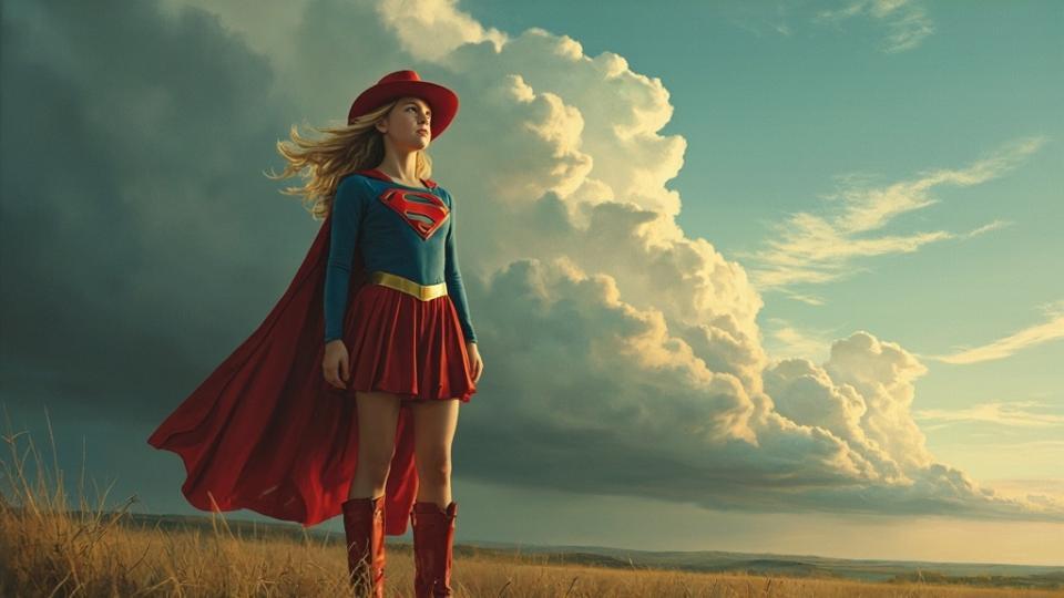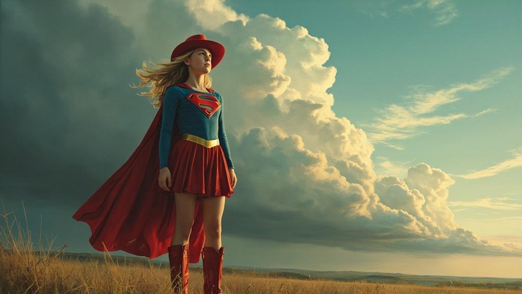 masterpiece, high quality, Oil Painting, a serene young teen Super Girl outside beneath a brooding sky, her posture is strong, graceful and contemplative. Super Girl has porcelain white skin, long flowing blond hair, blue eyes, petite body, and is skinny, yet with strongly defined muscles. She is in her iconic red and blue costume, featuring the classic 'S' emblem on her chest, a red peated skirt, a red cape, red boots and a cowboy hat. Her gloved hands rest gently in front of her as she gazes upward toward the horizon, where massive, towering storm clouds roll in with quiet intensity. The lighting is dramatic diffused sunlight filters through the edges of the clouds, casting a soft, golden glow that highlights the fine details of her attire and the calm resolve on her face. The setting is natural and windswept, with tall grasses bending around her and the faint outline of distant hills beneath the rising storm. sterpiece, intricate lines, intriguing atmosphere, sharp magnificent details, delicate features, elaborate details, ultra detailed, romantic, Rembrandt lighting, brush stroke, lovely, del1cate_balance style, in the style of Rembrandt. NixPort, novuschroma, vantablack
