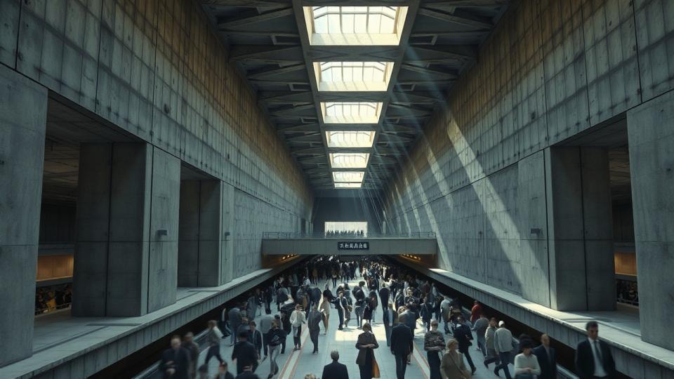 Massive brutalist concrete subway station at rush hour, towering angular platform with thick columns casting geometric shadows, dramatic shafts of harsh artificial light piercing through skylights illuminating crowds of commuters, oppressed workers in suits rushing through cavernous interior, vast oppressive scale contrasted with collective human movement, cinematic wide shot from elevated perspective, raytracing global illumination, hand-painted watercolor texture visible brushstrokes Studio Ghibli architectural style melancholic atmosphere, cold steel blue and warm amber color palette, architectural visualization render but with frame-by-frame animation aesthetics Unreal Engine 5 rendering quality