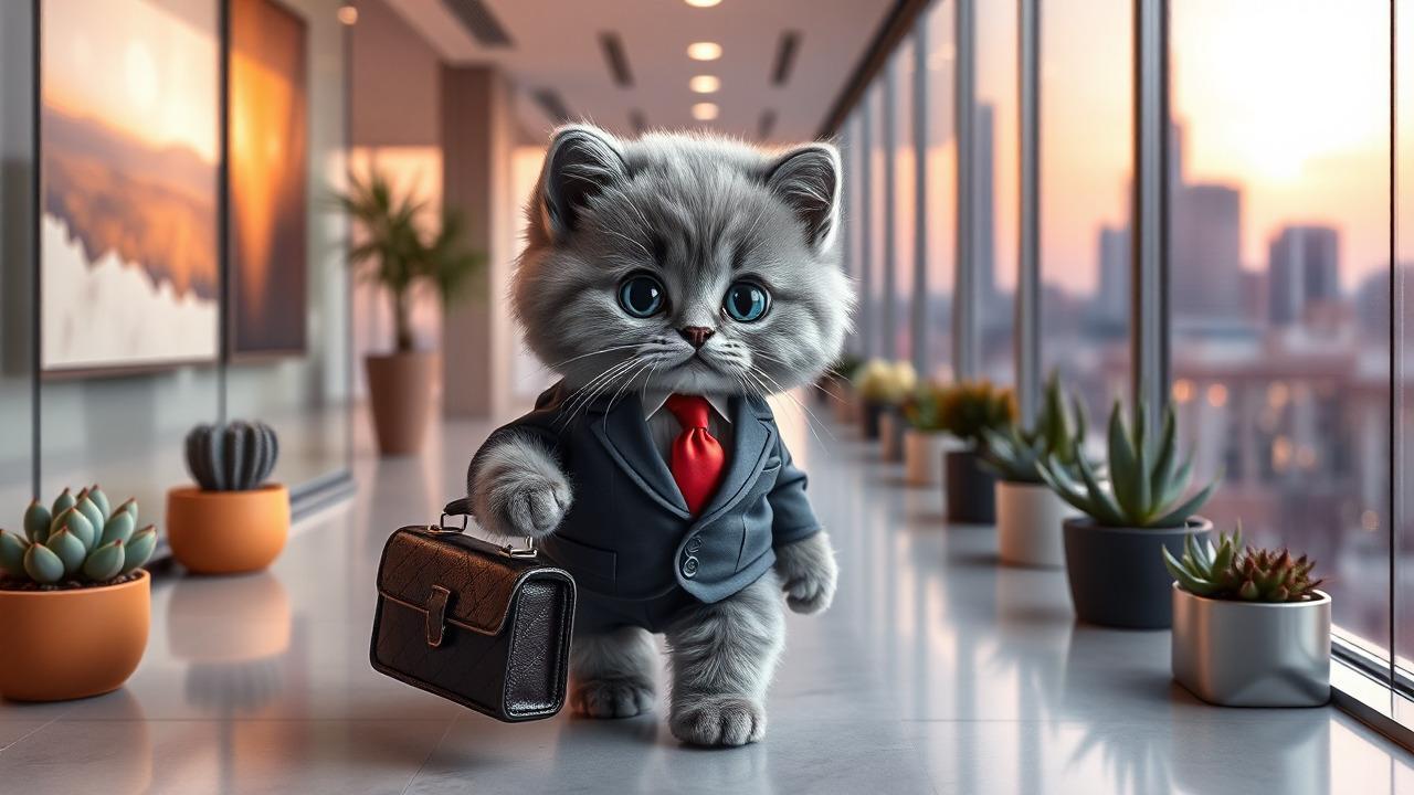 Cute fluffy gray kitten wearing a tiny black tailored business suit with crimson power tie and polished leather briefcase, confidently walking through sleek modern glass office hallway lined with succulents and abstract art, floor-to-ceiling windows showing twilight city skyline, soft evening amber and violet gradient lighting casting warm glow on fluffy fur, kawaii style with soft rounded shapes, dreamy pastel color palette of soft lavender and warm amber, adorable determined expression with ears perked forward, shareable social media art