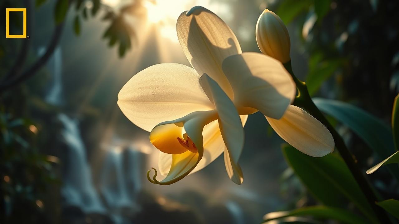An exotic orchid blossom at the peak of its bloom in a tropical rainforest at misty dawn, National Geographic quality macro botanical photography, delicate white petals with golden throat details illuminated by soft amber rays filtering through dense canopy, intricate pollen structures and dew-covered sepals visible in extreme close-up, mood of pristine tropical elegance and delicate floral majesty, soft white and deep emerald green palette with golden light accents, dramatic macro composition from forest floor emphasizing the flower's ethereal beauty against dark tropical foliage, shallow depth of field with cascading waterfalls and misty mountain silhouettes in soft focus, cinematic composition