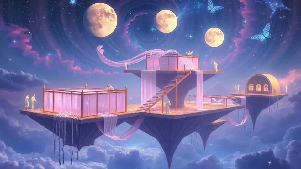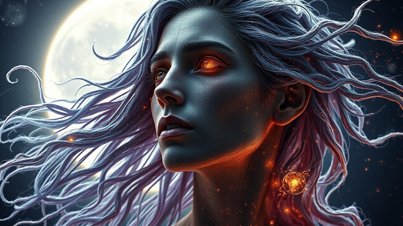 A hyperrealistic portrait of an ancient cosmic oracle, her weathered skin transforming from cracked parchment into cascading rivers of liquid starlight flowing with glowing silver and gold cosmic dust, flowing hair rippling as frozen nebula strands in deep violet and teal, both eyes blazing as twin ancient supernovas emitting focused beams of creation energy in amber and crimson, classical three-quarter composition with dramatic upward angle, intense moonlight from behind creating luminous silver rim glow on ethereal silhouette, transcendent mystical mood, deep cosmic indigo and ancient gold color palette with violet nebula wisps and silver stardust accents, masterpiece quality, 8k resolution