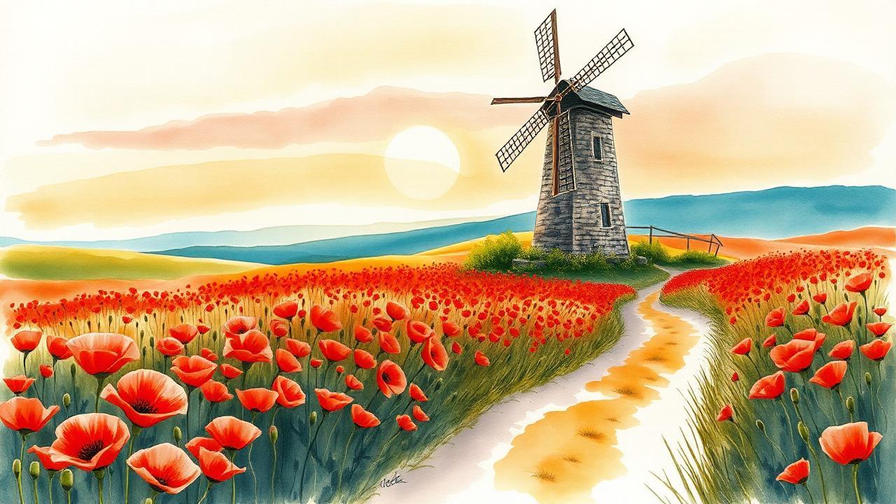 A weathered windmill standing tall amid rolling fields of scarlet poppies at sunrise, traditional watercolor painting, loose wet-on-wet washes depicting delicate flower heads swaying in gentle morning breeze, warm golden amber and coral tones of early light washing over the landscape, cool soft teal and lavender tones of distant hills, visible bold brushstrokes capturing the windmill's rustic wooden blades and crumbling stone structure, paper texture visible throughout, plein-air painting aesthetic, hopeful nostalgic mood, diagonal composition with rows of poppies leading toward the windmill on the horizon