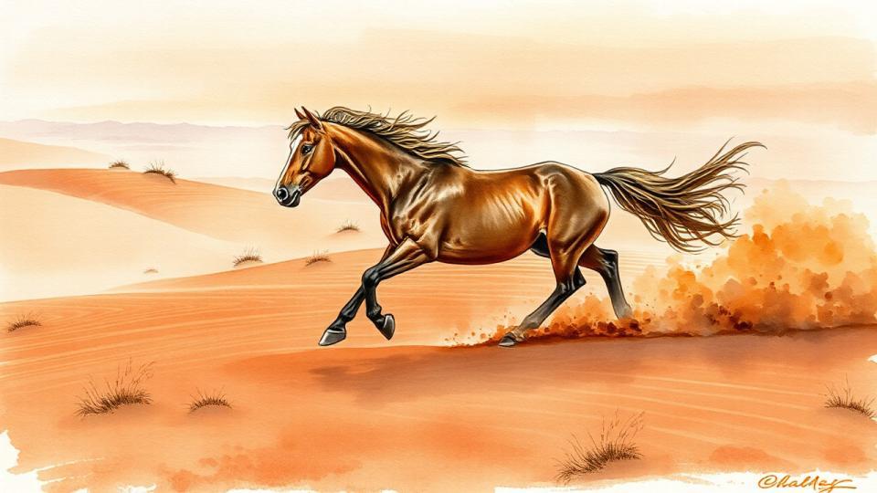 A wild horse galloping across misty amber dunes at sunset, traditional watercolor painting, loose wet-on-wet washes depicting golden sand ripples and sparse dried grass, warm burnt sienna and soft coral tones of fading daylight, cool violet and steel gray shadows creeping across the landscape, visible bold brushstrokes capturing the horse's flowing mane and powerful muscles, paper texture visible throughout, plein-air painting aesthetic, fierce untamed mood, dynamic diagonal composition with dust clouds trailing behind