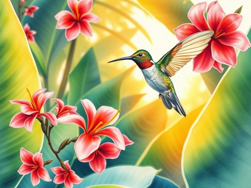 A delicate hummingbird hovering mid-flight near vibrant coral trumpet flowers in a tropical garden at sunrise, traditional watercolor painting, loose wet-on-wet washes depicting iridescent green and ruby throat feathers catching early light, warm golden amber and soft rose tones of morning sun filtering through lush tropical foliage, cool emerald and deep jungle green tones of large banana leaves, visible delicate brushstrokes capturing wing blur and flower petals, paper texture visible throughout, plein-air painting aesthetic, joyful lively mood, close-up diagonal composition with hovering bird and cascading blooms