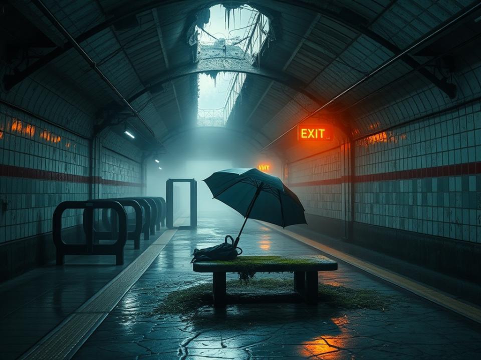 An abandoned underground subway station at midnight, water dripping from cracked concrete tunnels, rusted ticket barriers standing open like silent guardians, shattered ceramic tiles reflecting pale moonlight from a collapsed ceiling shaft, a single tattered umbrella left on a moss-covered bench, thick mist rolling across cracked platform tiles, muted steel-gray and deep teal palette with one warm amber glow from a dying emergency exit sign, atmosphere of forgotten commutes and solitary late-night wanderers, photorealistic, cinematic composition, high detail