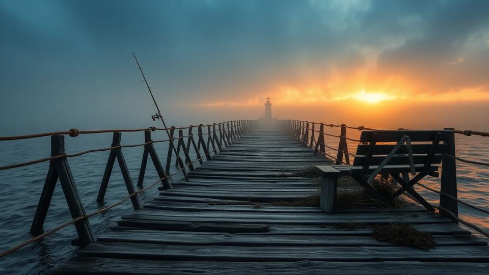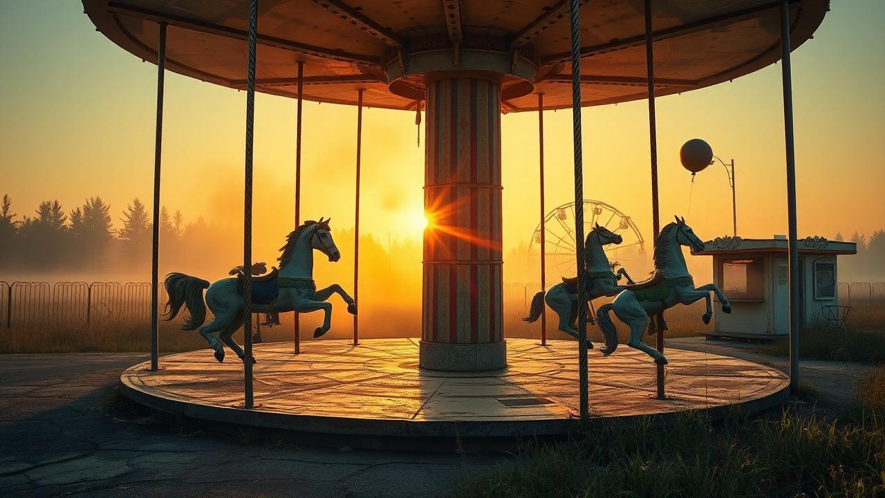 An abandoned fairground carousel at twilight, weathered painted horses frozen mid-gallop on rusted metal poles, twisted rainbow stripes peeling from the ride's central column, thick evening fog rolling across cracked asphalt between empty ticket booths, a single deflated balloon caught on a broken lamp post, dying amber sunset rays piercing through broken Ferris wheel spokes casting long shadows across overgrown grass, faded cream and dusty teal palette with one warm lantern glow from an abandoned ticket booth window, atmosphere of forgotten laughter and solitary twilight rides, photorealistic, cinematic composition, high detail