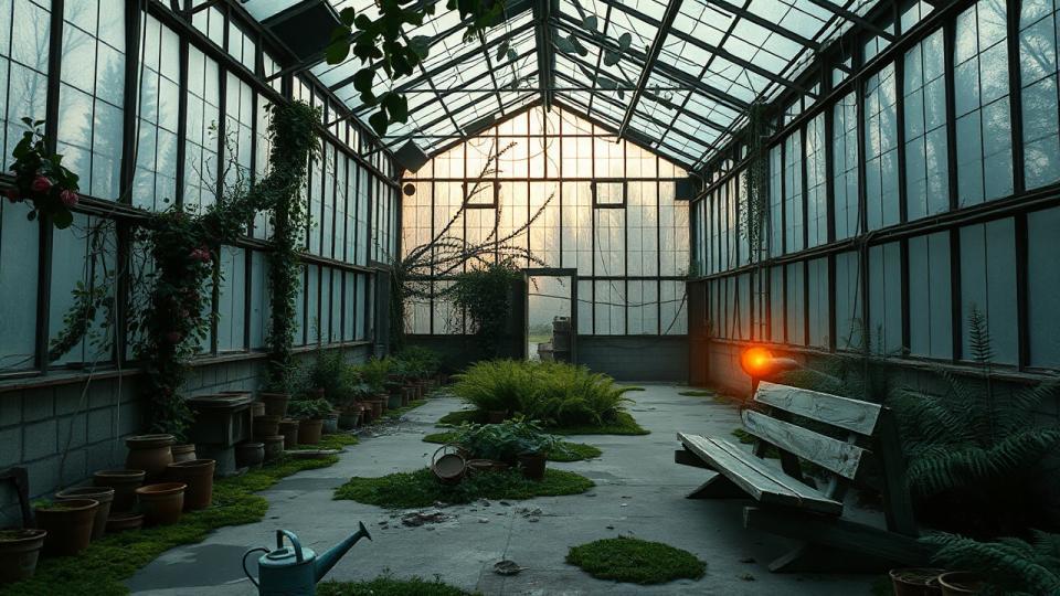 An abandoned greenhouse at dusk, towering glass panels cracked and broken, wild climbing roses overtaking rusted metal frames, scattered terracotta pots across moss-covered concrete floors, dying amber sunlight streaming through shattered roof casting long shadows across wild ferns, a single weathered wooden bench beside an overturned watering can, thick evening fog rolling beneath benches, muted dusty sage and steel gray palette with one warm copper glow from a broken doorknob catching last light, atmosphere of forgotten cultivation and solitary botanical decay, photorealistic, cinematic composition, high detail