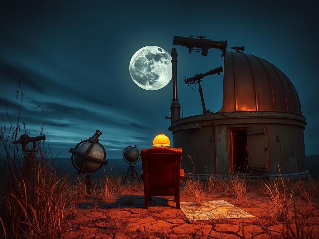 An abandoned observatory on a lonely hill at twilight, massive copper dome collapsed exposing antique telescopes pointed at empty sky,attered star charts floating in stale air, a single weathered leather astronomer chair facing frozen equipment, moonlight piercing through shattered dome casting silver beams across dust-covered celestial globes, wild grass growing through cracked observatory floor, muted deep navy and tarnished bronze palette with one warm amber glow from a forgotten desk lamp left burning for decades, atmosphere of forgotten cosmic wonder and solitary stargazers, photorealistic, cinematic composition, high detail