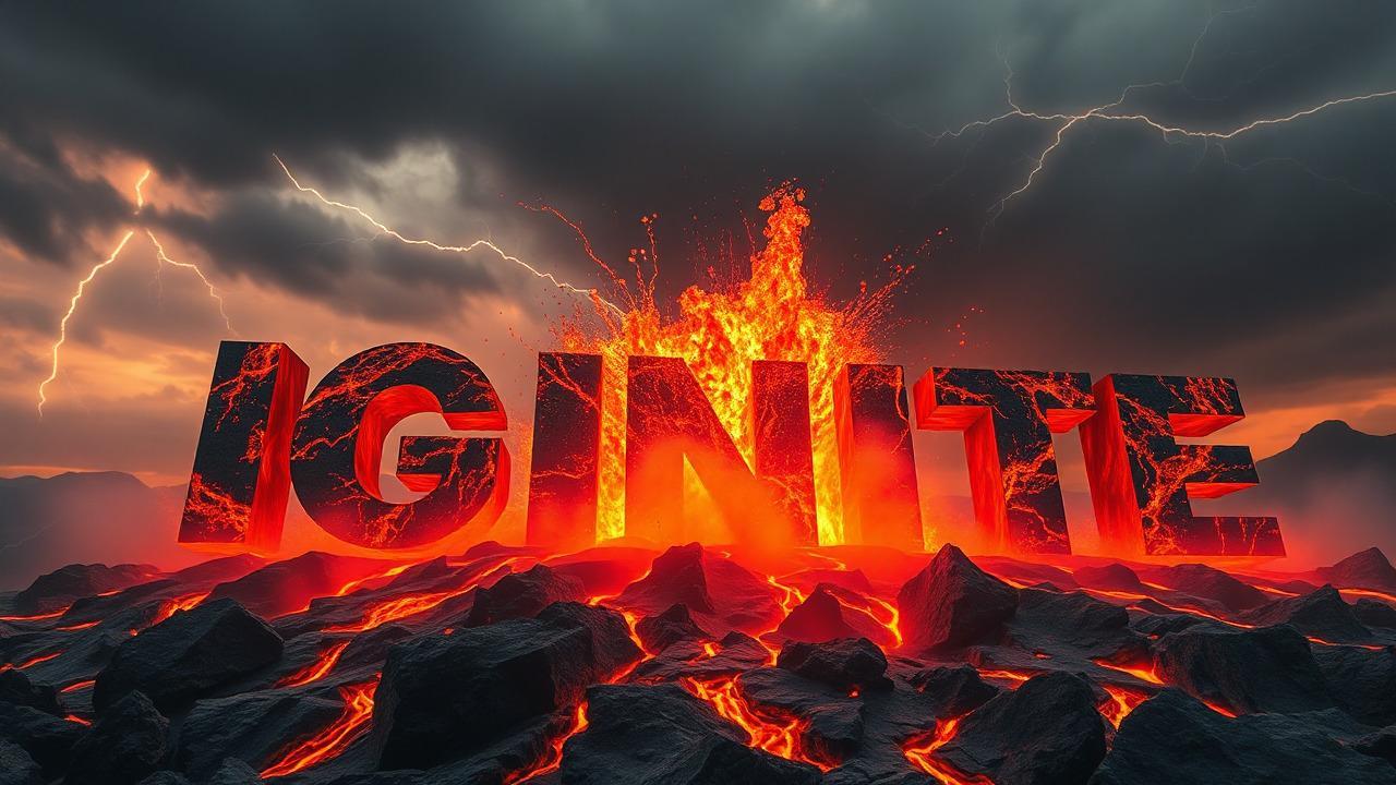 The word IGNITE rendered as explosive volcanic eruption, each letter formed by flowing molten lava solidifying into brutalist typography, massive bold letters emerging from crater, glowing orange and crimson magma rivers cascading down volcanic rocks, Swiss grid composition shattered by volcanic ash and digital distortion, stormy grey and amber sky with lightning strikes, volumetric heat haze, experimental typography poster art, hyper-detailed 3D environment, dramatic low-angle perspective, cinematic composition