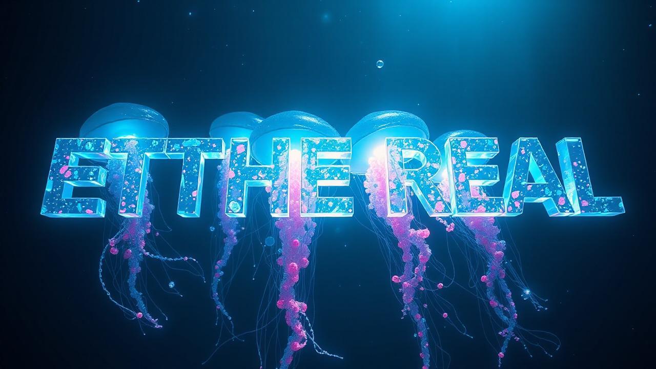 The word ETHEREAL rendered as ethereal jellyfish composed of flowing holographic liquid glass floating through an abyss, each letter morphing into bioluminescent tentacle formations, oversized brutalist typography suspended in deep ocean trenches, Swiss grid composition shattered by floating digital particles, midnight navy and phosphorescent cyan palette with coral pink highlights, volumetric god rays piercing from above, experimental typography poster art, hyper-detailed 3D environment, cinematic upward perspective toward surface light, ethereal mood