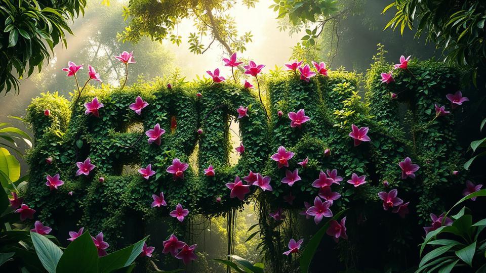 The word VERDANT rendered as massive brutalist typography constructed from twisting living vines and blooming flowers, each letter growing and intertwining with lush rainforest foliage, oversized bold text forming an enchanted garden canopy, Swiss grid composition disrupted by organic plant growth, emerald green and golden sunlight palette with orchid purple and coral pink flower accents, volumetric morning mist filtering through leaves, experimental typography poster art, hyper-detailed 3D environment, dramatic upward perspective through dense vegetation, cinematic composition
