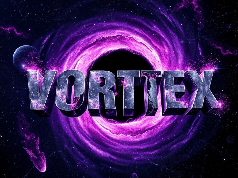 The word VORTEX rendered as massive brutalist typography forming the mouth of a supermassive black hole, each letter stretching and warping by extreme gravitational lensing, swirling accretion disks of superheated plasma orbiting the text, oversized bold typography consuming surrounding star fields, Swiss grid composition shattered by digital space-time distortion artifacts, deep cosmic black and blazing white palette with electric violet and hot pink plasma tendrils, volumetric gravitational lensing effects, experimental typography poster art, hyper-detailed 3D astronomical environment, cinematic side-angle perspective toward the cosmic vortex, dramatic space opera mood