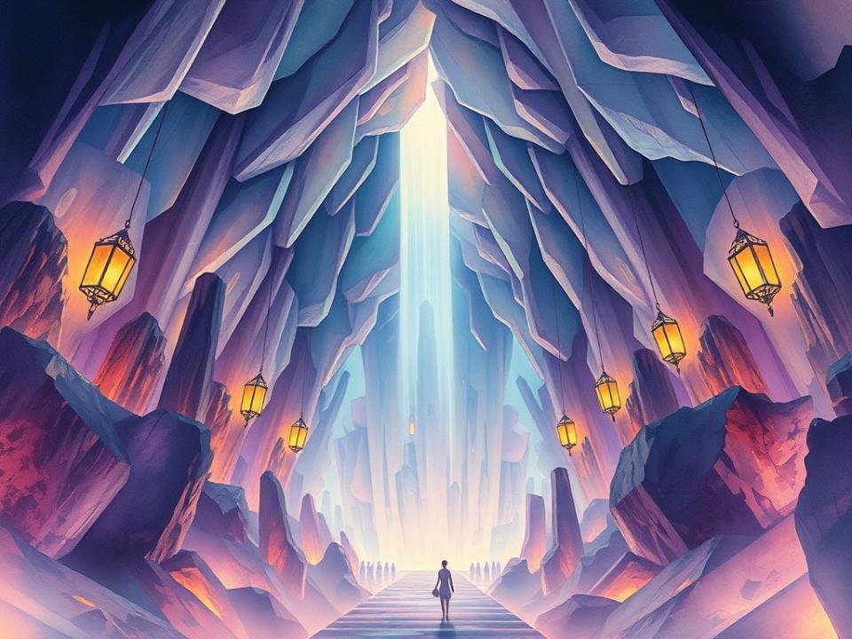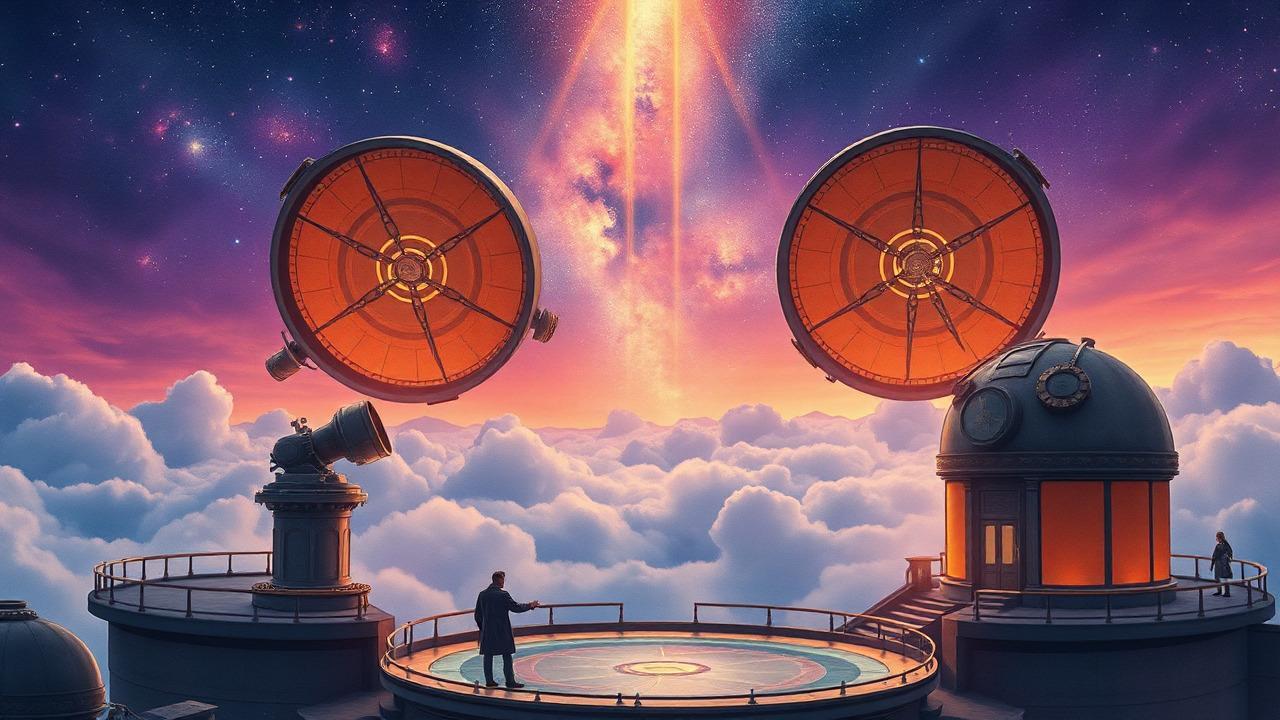 A futuristic astronomical observatory suspended in perpetual twilight clouds, massive circular telescope domes with brass mechanisms and glass floors, astronomers in flowing coats tending to holographic star charts, warm amber interior glow contrasting with cool violet nebula sky, hand-painted watercolor textures with visible brushstrokes, volumetric god rays piercing through cloud layers, frame-by-frame animation quality, cinematic upward spiral composition, Studio Ghibli aesthetic with paper grain overlay, rich palette of warm copper, deep violet and soft cyan