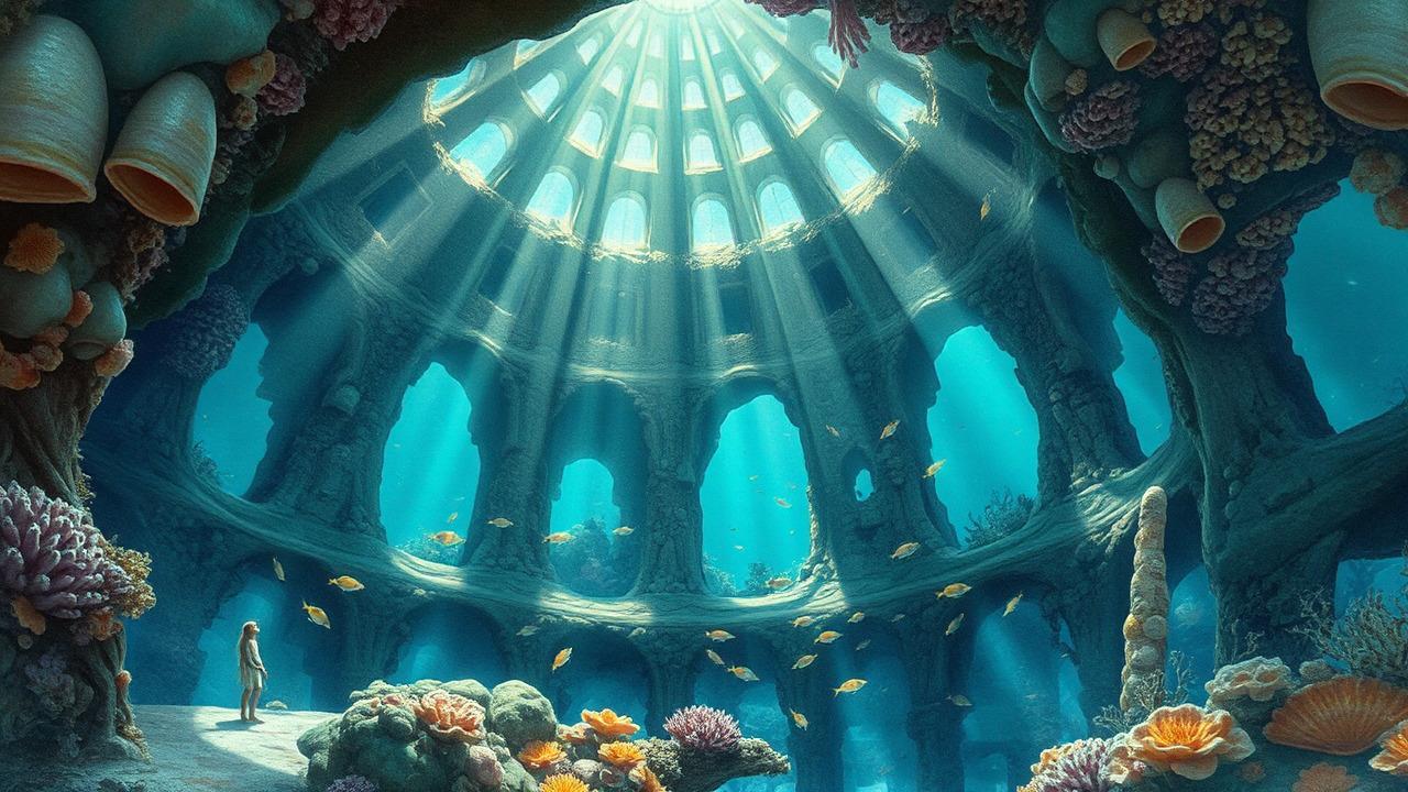 An abandoned underwater coral city being reclaimed by nature, massive organic architecture built from living coral and iridescent shells, soft rays of sunlight piercing through turquoise water, schools of luminous fish swimming through broken dome windows, hand-painted watercolor textures with visible brushstrokes, volumetric god rays, melancholic yet hopeful atmosphere, paper grain overlay, cinematic wide shot, deep ocean blues and amber bioluminescence palette