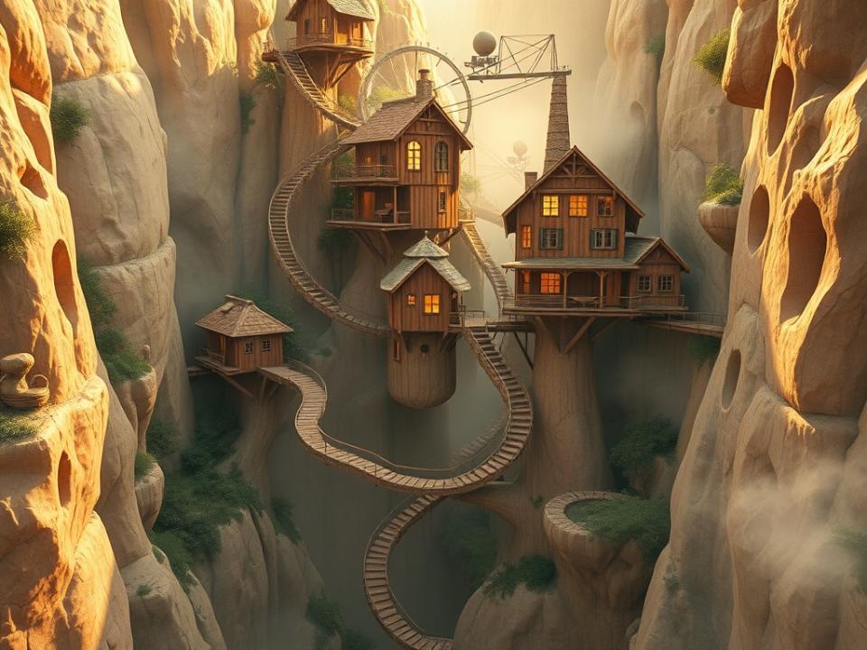 A futuristic treehouse village nestled in a misty canyon, organic wooden structures connected by rope bridges and spiral staircases, warm golden morning light filtering through canyon walls, terracotta and amber colored dwellings with modern sustainable technology integrated into natural wood, hand-painted watercolor textures with visible brushstrokes, volumetric mist rolling through the valley, frame-by-frame animation aesthetic, Studio Ghibli aesthetic with paper grain overlay, cinematic wide shot capturing village depth, deep rust and soft sage palette with warm golden light rays, rendering: raytracing global illumination volumetric lighting PBR materials
